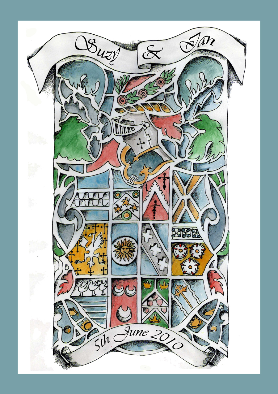 “For our wedding we asked Helen to create us a design for our invites. We told her we were getting married at Beaumanor Hall in Leicestershire and asked Helen to create a design linked to the hall. Helen used the main stained glass window in the main foyer to create a design incorporating our names and the date. The design was beautiful and worked wonderfully with our ideas for the day. It was lovely to have a piece of artwork that was really individual and personal to us, to use to invite our friends and family to our special day. So many people commented on the invite saying how unusual and beautiful it was. We now have the framed original drawing hanging in our bedroom reminding us every day of our memorable day”